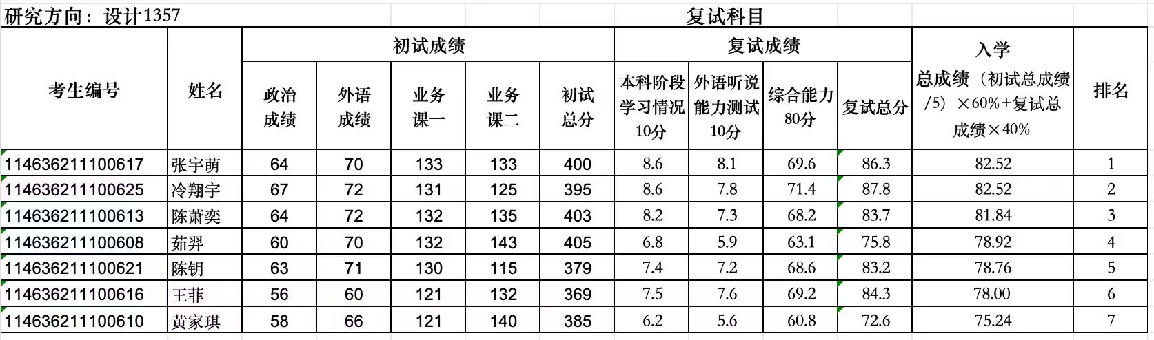 2026年艺术设计学院设计1357专业研究生入学总成绩(一志愿)
